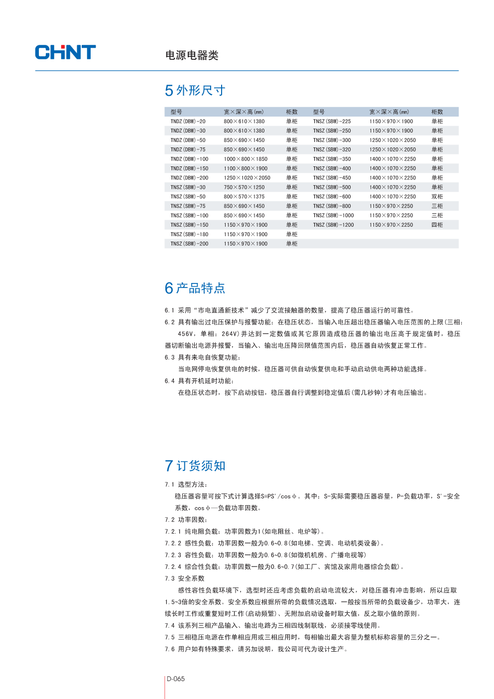 分为单相TNDZ(DBW型)、三相TNSZ(SBW型)二种,与其它形式稳压器相比具有容量大、效率高、无波形畸变、电压调节平稳,适用负载广泛,能承受瞬时超载,可长期连续工作,手控自控随意切换,设有过压、短路、相序保护功能等,使用安装方便,运行可靠等特点。可广泛应用于工业、农业、交通、邮电、军事、铁路、科研文化等领域的大型机电设备、金属加工设备、生产流水线,建筑工程设备、电梯、医疗器械、微机机房、电脑控制设备、刺绣轻纺设备、空调、广播电视、宾馆及家用电器照明等需要稳压的场所